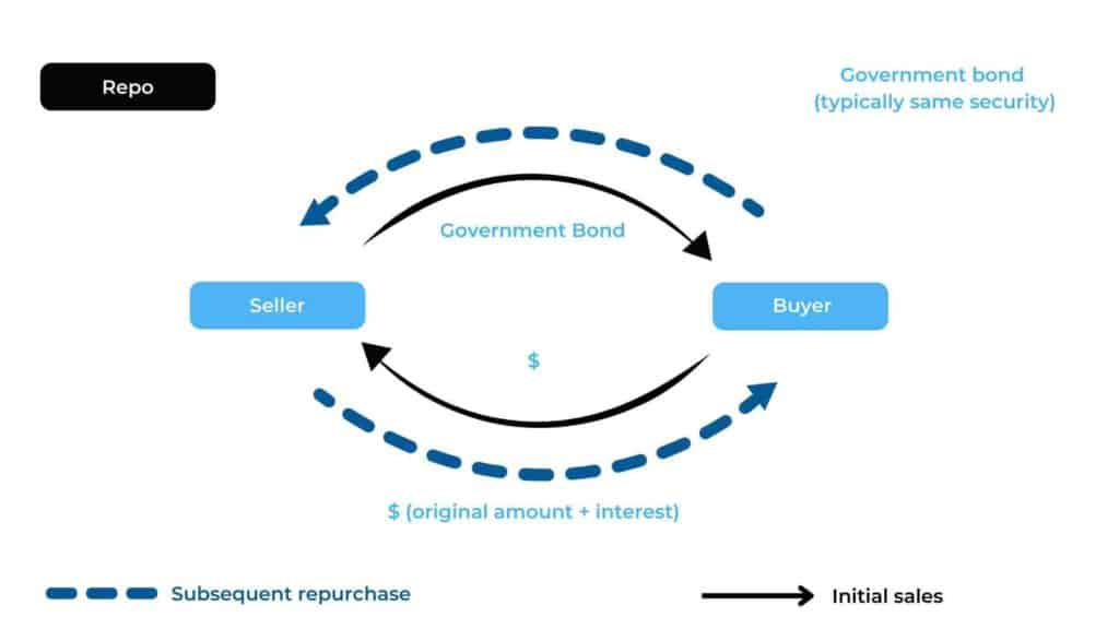 A repurchase agreement (repo) is a form of short-term secured loan where one party sells securities to another and agrees to repurchase those securities later at a higher price with the securities serving as collateral for the borrower. The difference between the securities’ initial price and their repurchase price is the interest paid on the loan, known as the repo rate. A reverse repurchase agreement (reverse repo) is the mirror of a repo transaction. In a reverse repo, one party purchases securities and agrees to sell them back for a positive return at a later date, often as soon as the next day. Most repos are overnight, though they can be longer.