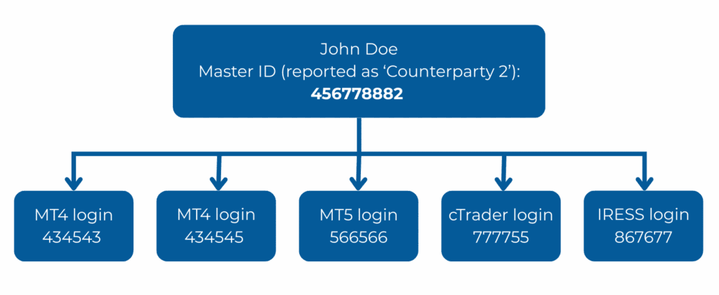 See below example of how a client (who is Counterparty 2), may have various platform IDs and logins under their relevant Unique Client ID and legal name, as they are using multiple platforms for their trading: