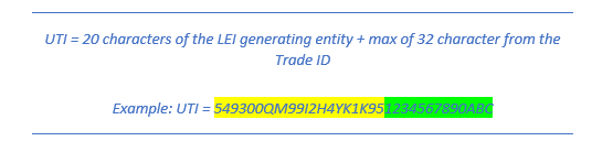 UTIs should consist solely of alphanumeric characters and be composed of a combination of the LEI of the generating entity and a unique code created by that entity. Under the EMIR Refit (EU & UK), MAS and ASIC regulations, the total number of characters allowed for the UTI remains 52 characters.