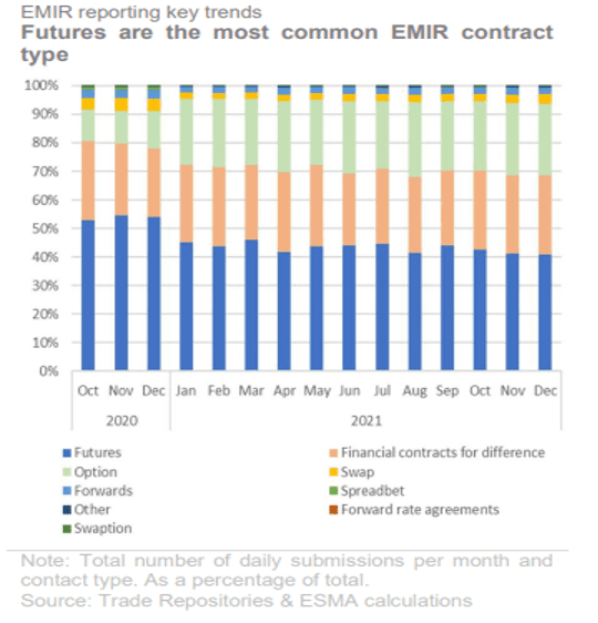Chart 1 demonstrates that futures are by far the most common contract type reported under EMIR. Futures and Financial CFDs on average reflected around 70% of all reporting volumes from October 2020 through to the end of December 2021.