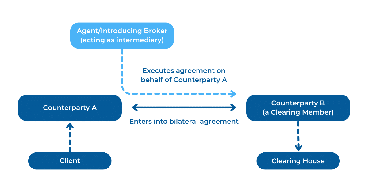 This is why EMIR does not consider such capacities as falling under the scope of a ‘counterparty’ to the relevant transaction. Rather, the client you are acting on behalf of by executing the contract, is the counterparty along with the party it is facing in the relevant transaction. See below diagram.
