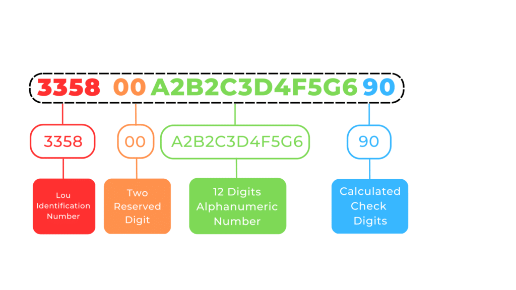 The LEI code is constructed by several parts, the first four digits identify the local operating unit, the next two are always 0, characters 7-18 are unique to each entity and the last two are used for verification purposes. See the diagram below: