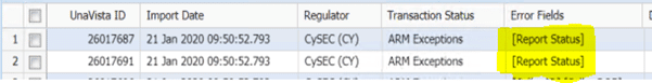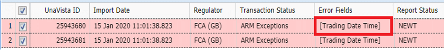 We often see our clients populate the Trade Date Time fields in the wrong format. This ARM exception gives an error message of [Trading Date Time]. See below how it appears: